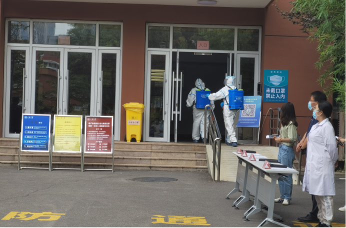 在兴隆山校区教学楼E座及软件园校区教学四区,工作人员均演练模拟了校区接到地方疫情防控部门协查某学院学生为疑似密接或次密接者的应急处置情况。演练中,校区疫情防控指挥小组与驻地单位密切配合,演练了在接到地方疫情防控协查报告后的信息及时报送、学生身份排查、校门封控、区域封控、人员隔离及心理疏导、转运密接或次密接者、行程区域全面消杀、健康监测与核酸检测等一系列全员全要素应急防控措施场景,整个演练过程紧凑有序、平稳高效。