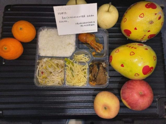 12月6日,由兴隆山校区学生骨干服务队为隔离的同学送去兴隆山校区欣园餐厅提供的水果、食物等物资,并附上了由学生骨干服务队成员亲自书写的暖心明信片,给予同学问候与鼓励。学生骨干服务队积极了解学生基本情况并与学生保持沟通,积极回应学生诉求,让学生感受到来自学校和同学们的贴心关怀。此外浴超等校区单位为学生每个月配送20份暖心礼包,含有水果、牛奶、零食等食物与牙刷、牙膏、香皂等生活用品,第一时间将关怀和温暖及时送到疫情防控一线的师生手中。
