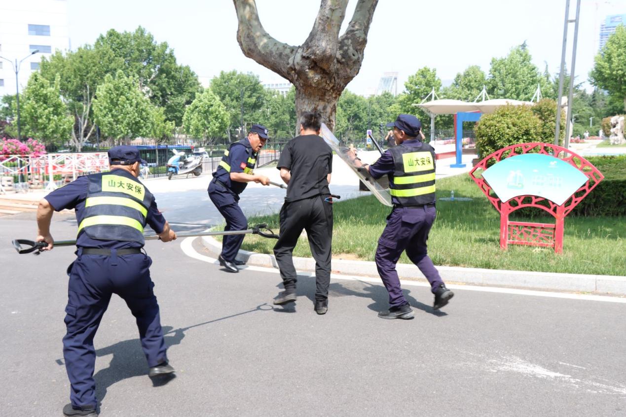 在反恐演练中,门岗安保队员及时发现两名企图持械硬闯校园的“歹徒”,立即上前劝阻并迅速报告指挥中心。校区反恐应急处置小组接警后依照应急预案迅速反应,安保队员手持钢叉、盾牌抢占有利位置,将“歹徒”成功制服。在消防演练中,模拟了教学楼突发火情,消防中控室值班人员接到烟感报警后立刻上报,队长即刻命令校区消防救援小组迅速到位,警戒组、灭火组、搜救组按照分工与职责迅速拉起警戒、疏散师生并展开灭火救援,确保在最短时间内成功扑灭了火情,保护了师生生命安全。